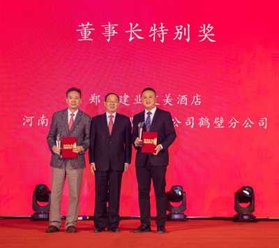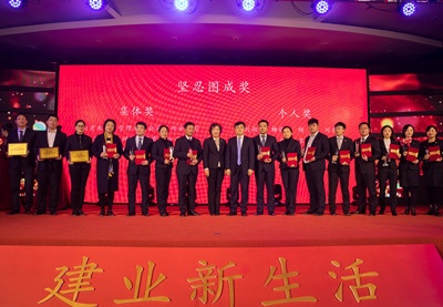 建業(yè)新生活總裁曹仰峰、副總裁周建慧為獲獎(jiǎng)?wù)哳C發(fā)“堅(jiān)忍圖成獎(jiǎng)”