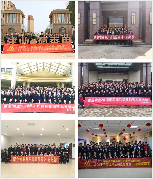 早春三月,萬(wàn)物生長(zhǎng)。為持續(xù)提升建業(yè)物業(yè)服務(wù)品質(zhì)、提高客戶滿意度,打贏2018年建業(yè)物業(yè)各項(xiàng)攻堅(jiān)戰(zhàn), 3月13日-26日,物業(yè)總公司各職能部門總經(jīng)理在建業(yè)物業(yè)總經(jīng)理許靜、副總經(jīng)理張禮輝的帶領(lǐng)下,兵分兩路,深入一線,在各地市分公司共計(jì)開(kāi)展了十八場(chǎng)2018年工作目標(biāo)貫徹落實(shí)宣講大會(huì)。每場(chǎng)宣講大會(huì),各分公司總經(jīng)理、職能部門全體員工、各小區(qū)經(jīng)理,管家、接待及維修、禮兵、保潔等各歸口主管人員均悉數(shù)到場(chǎng),認(rèn)真聆聽(tīng),用心體會(huì),累計(jì)參會(huì)人員達(dá)1200余人。