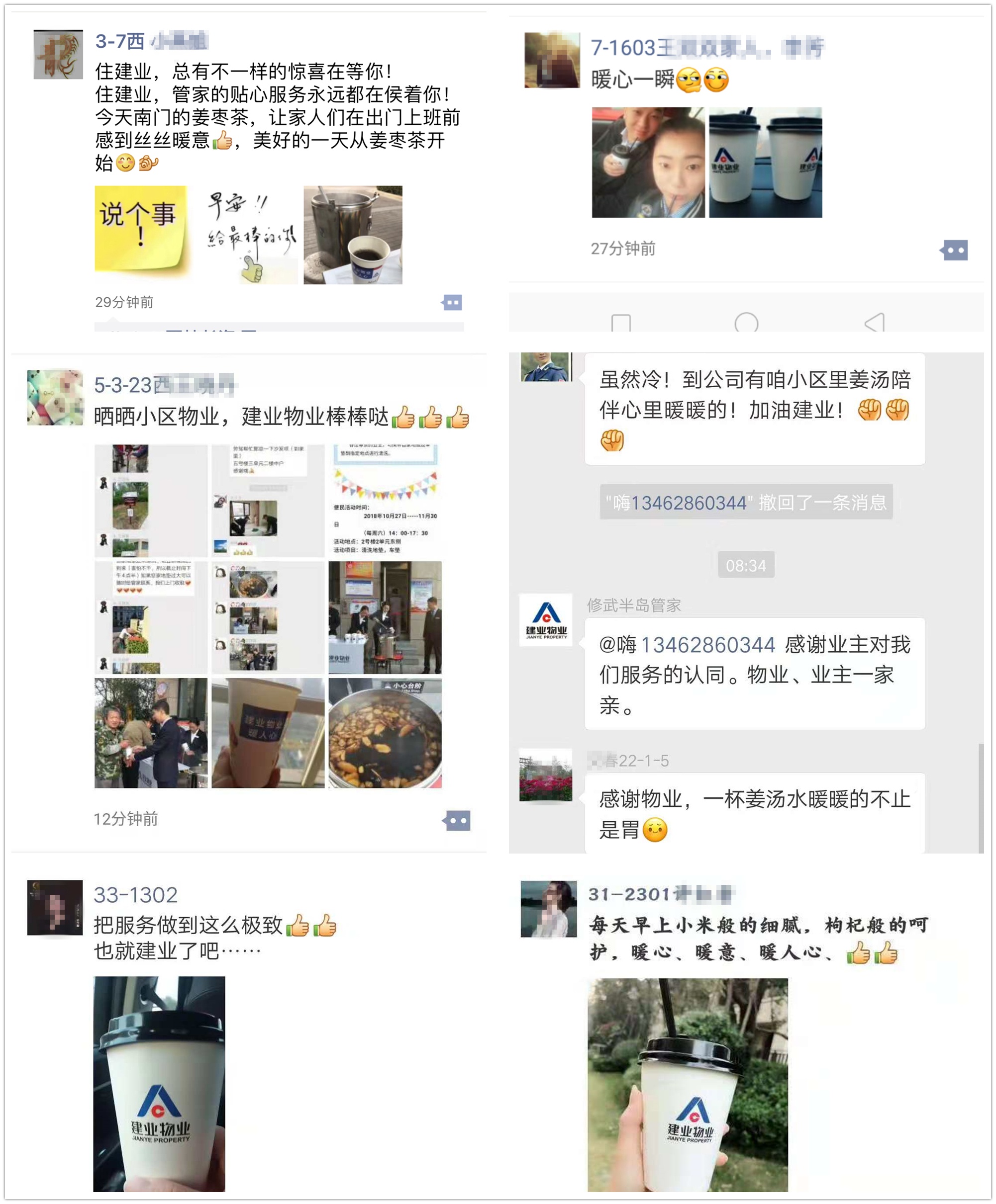 據(jù)統(tǒng)計,短短兩周內(nèi),建業(yè)物業(yè)全省130余個小區(qū)共開展暖心熱飲派送活動582場,各個物業(yè)服務(wù)中心齊動員,累計派送姜糖茶、姜棗茶、養(yǎng)生粥、養(yǎng)生豆?jié){、冰糖雪梨水等熱飲67121杯。一張張笑臉,驅(qū)散了寒冷;一杯杯熱飲,暖胃更暖心!