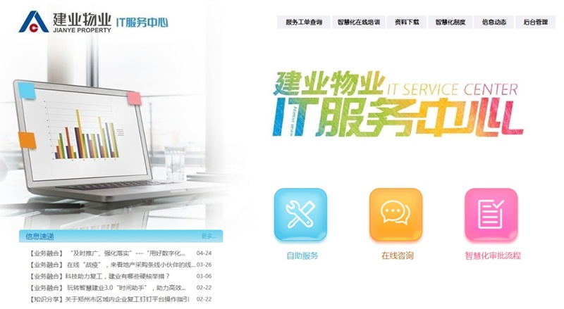 建業(yè)物業(yè)IT服務(wù)中心現(xiàn)集成了自助服務(wù)(智慧化報修)、在線培訓(xùn)、資料下載、智慧化制度、信息動態(tài)、智慧化審批流程等六項服務(wù)。通過智慧建業(yè)門戶首頁,企業(yè)內(nèi)部用戶可快速找到入口并進入IT服務(wù)中心,查看各項智慧化系統(tǒng)的學(xué)習(xí)資料、智慧化建設(shè)相關(guān)的制度與流程、常見問題的處理方法以及行業(yè)學(xué)習(xí)資料。