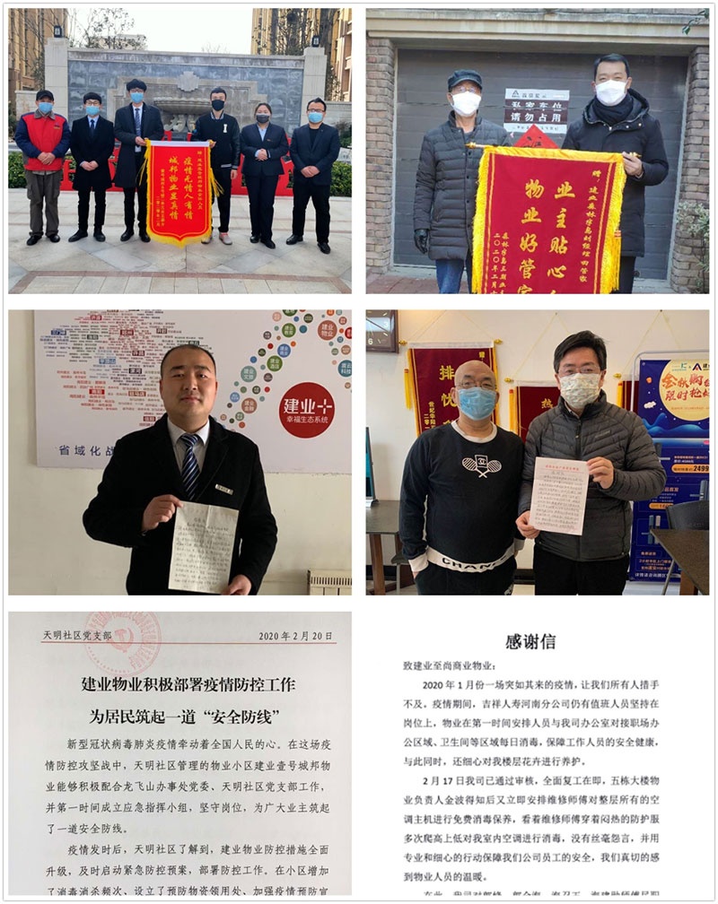 2020年春節(jié)前后,一場突如其來的疫情席卷全國,建業(yè)物業(yè)在管的近300個小區(qū)第一時間啟動一級響應(yīng),一萬多名建業(yè)物業(yè)人紛紛主動放棄春節(jié)假期,陸續(xù)奔赴到崗。在這場全民戰(zhàn)“疫”的行動中,涌現(xiàn)出一批批令人感動而印象深刻的人和事。2月,建業(yè)物業(yè)在管小區(qū)共涌現(xiàn)出疫情防控、拾金不昧、技藝高超、熱情服務(wù)、助人為樂等各類好人好事共計253例,其中收到錦旗25面,感謝信69封,來電感謝及其他159起。