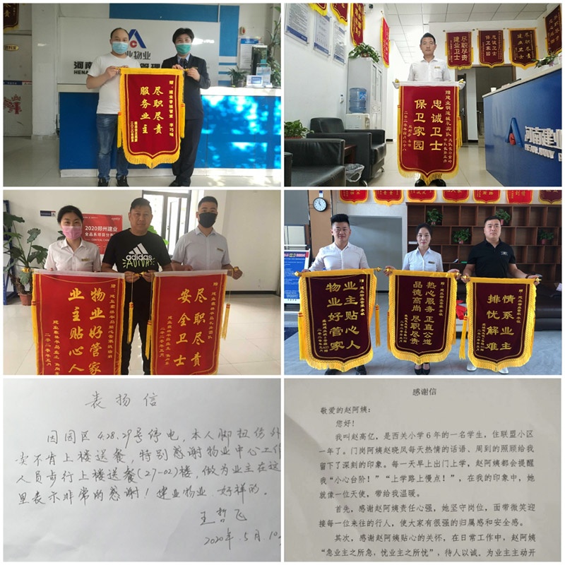 5月,建業(yè)物業(yè)各分支機(jī)構(gòu)共發(fā)生好人好事627件,其中錦旗148面,感謝信181封,致電表揚(yáng)等形式308次。