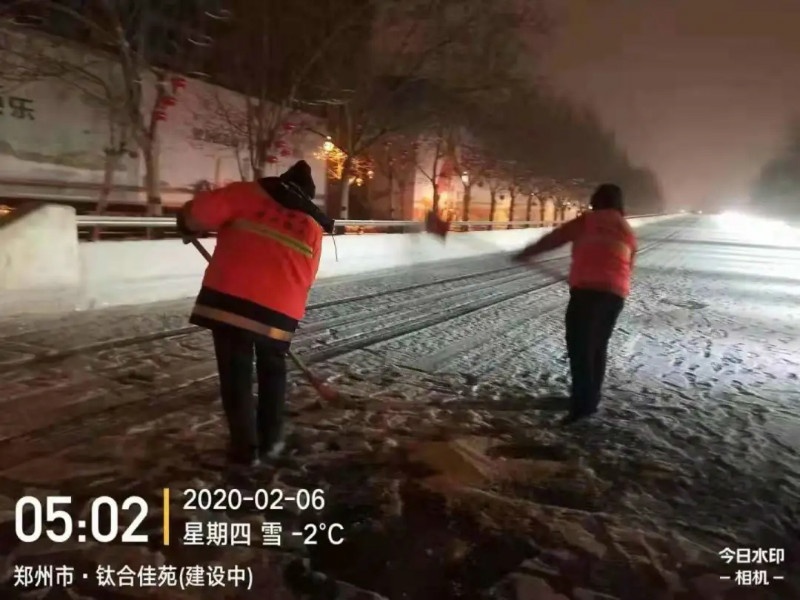 疫情期間的道路清潔任務(wù)比平日里要重得多,突變的環(huán)境更增加了環(huán)衛(wèi)工人的壓力。2月5日夜間至2月6日早上8點(diǎn),鄭州突降大雪,抗疫正在關(guān)鍵時(shí)期,風(fēng)雪“滋養(yǎng)”環(huán)境,建業(yè)物業(yè)鄭州二七環(huán)衛(wèi)項(xiàng)目迅速反應(yīng),積極部署,420名員工展開清雪除雪行動(dòng)。