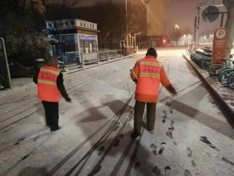建業(yè)物業(yè)鄭州二七環(huán)衛(wèi)工人首先在上下橋口、主干道、天橋等地集中撒鹽,緊接著再集中力量,用鐵锨、掃把、推雪板、推雪鏟清理主干道、使用垃圾清運(yùn)車集中運(yùn)輸積雪,道路上的積雪清除干凈后,他們并沒有停下來,立即著手使用機(jī)械化清掃車進(jìn)行路面洗掃、沖洗……近8個(gè)小時(shí)的不間斷作業(yè),終于將一條條主干道清理干凈。