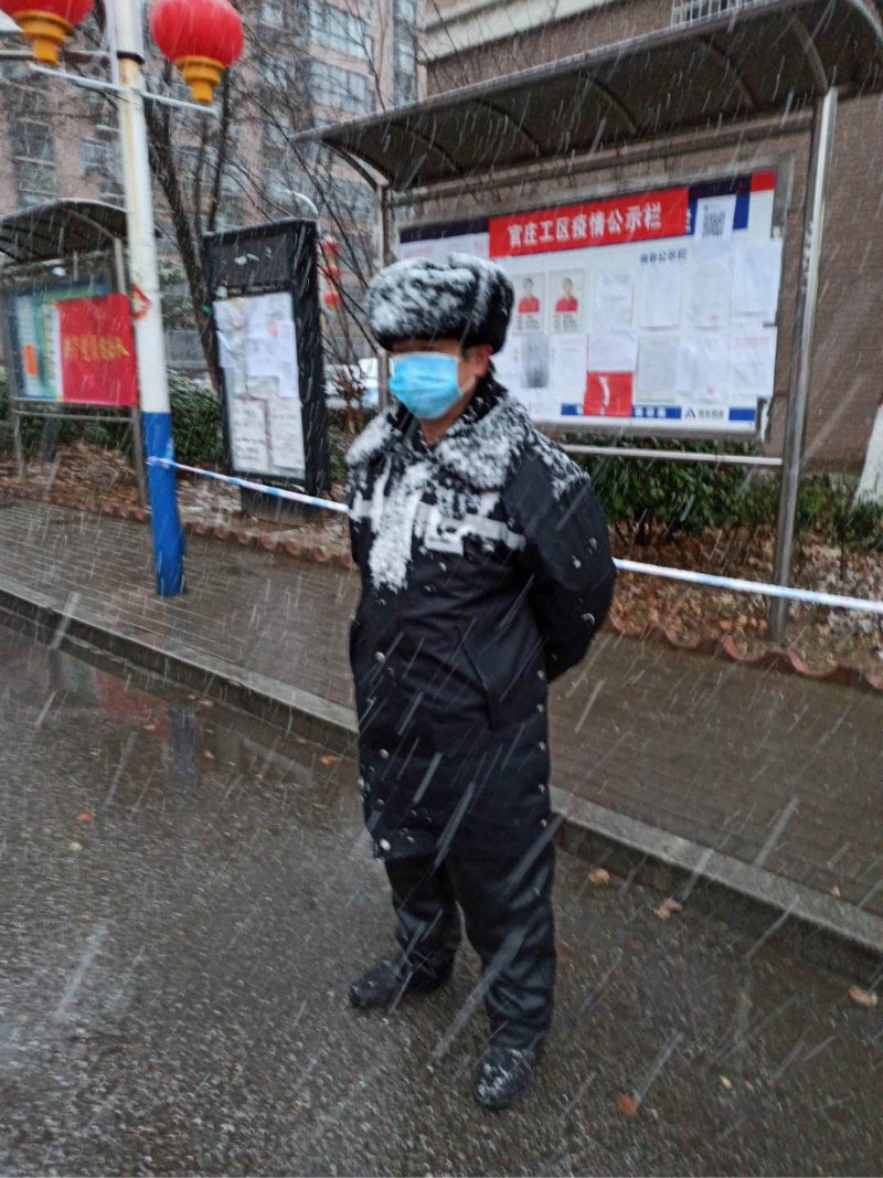 不巧的是,泰山小區(qū)值班室因電路故障無法正常取暖,室外大雪紛飛,室內(nèi)寒氣逼人。但南陽魏崗片區(qū)的禮兵沒有一人因寒冷而離開崗位,他們面迎寒風,身披雪花,對出入小區(qū)車輛、人員檢查登記和往常一樣認真。他們堅定內(nèi)心、堅守崗位,將時刻守護業(yè)主的責任牢牢地扛在肩上。