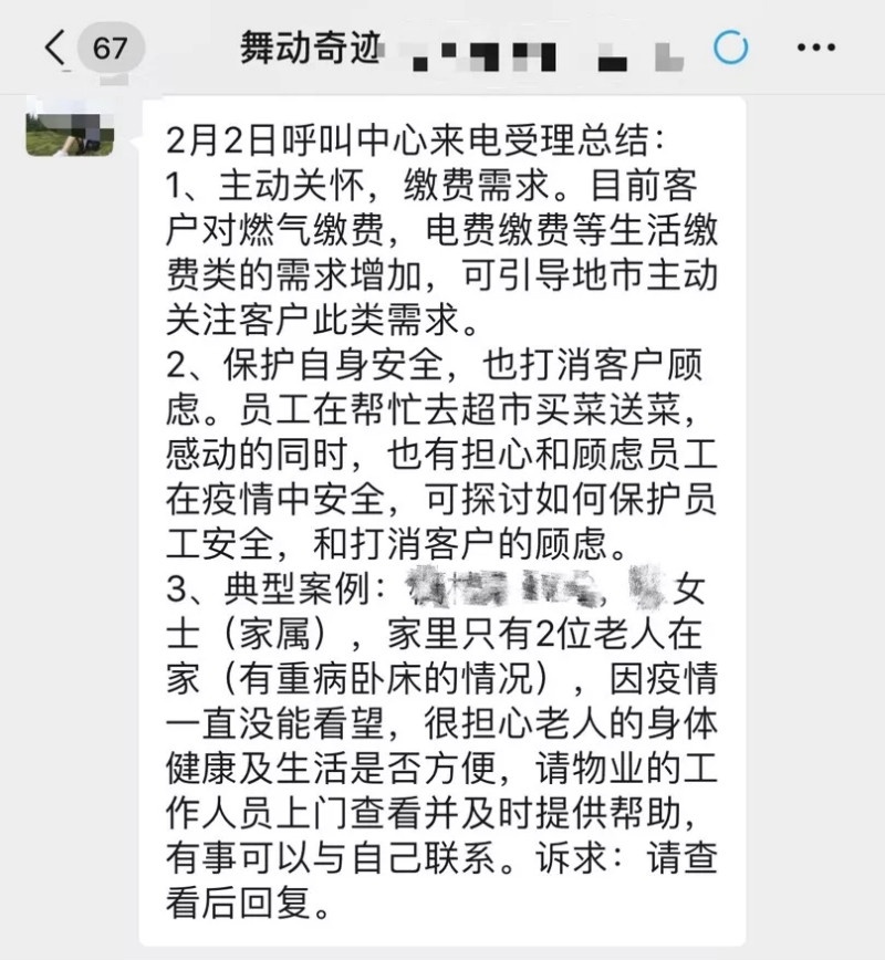 幾位獨居老人在家自我隔離期間藥品或生活物品短缺,反饋給呼叫指揮中心后,建業(yè)物業(yè)敏銳的捕捉到疫情期間全省中老年人的特殊需求,主動關(guān)懷、主動服務(wù),組織全省各個小區(qū)開始根據(jù)業(yè)主檔案篩選出重點關(guān)懷對象,并在疫情時期提供特殊關(guān)懷,解決了多位老人的后顧之憂。