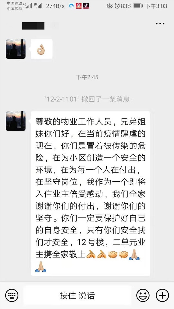 一位建業(yè)業(yè)主,同時也是集團高層領(lǐng)導(dǎo),當(dāng)她看到奮戰(zhàn)在一線、可敬又可愛的建業(yè)物業(yè)人,每天每一時刻用血肉之軀,筑起業(yè)主安全的長城時,特別感動、特別感謝,多次流下眼淚,特發(fā)來2萬元紅包給一線的物業(yè)員工,助力物業(yè)防疫工作的進行!