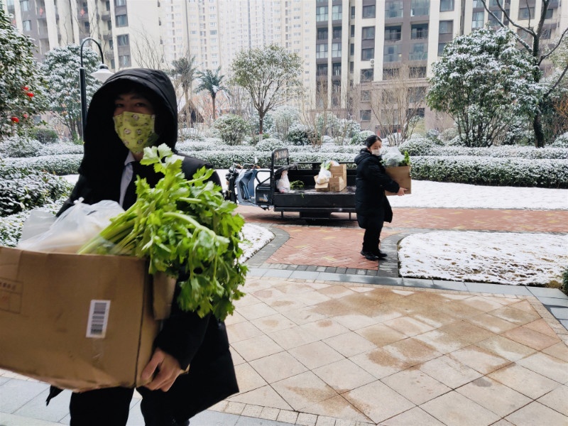大雪紛飛,天寒地凍。建業(yè)物業(yè)管家一大早買(mǎi)來(lái)了新鮮蔬菜,正馬不停蹄地為業(yè)主配送。