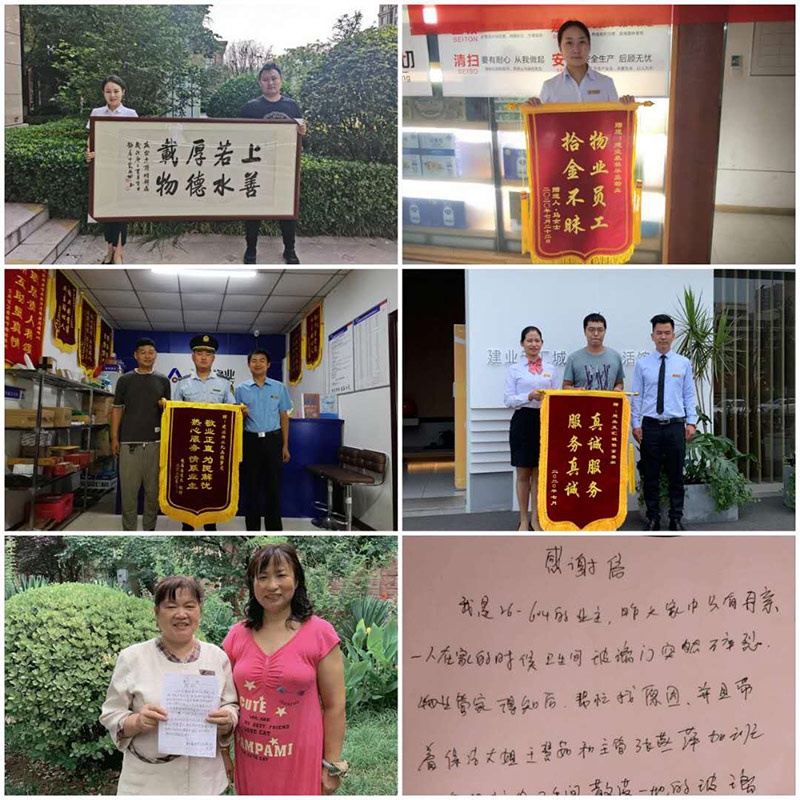 7月份,建業(yè)物業(yè)各分支機(jī)構(gòu)共產(chǎn)生好人好事510件,其中錦旗91面、感謝信100封、其他致電表揚(yáng)等319次。