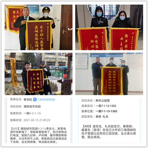 2月8日,淮陽·桂園19號(hào)樓業(yè)主潘先生來到物業(yè)服務(wù)中心,為管家周艷芳、維修工孔德夫送上一面錦旗,以表感謝。
