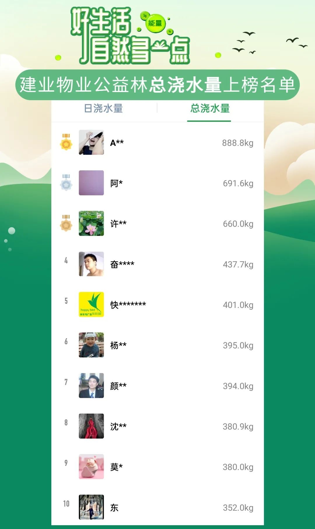 支付寶【螞蟻森林】建業(yè)物業(yè)公益林低碳打榜賽活動雖已結(jié)束,但業(yè)主的熱情依然不減,在日常生活中踐行低碳的生活方式,并持續(xù)為建業(yè)物業(yè)公益林澆水,為公益事業(yè)貢獻力量。