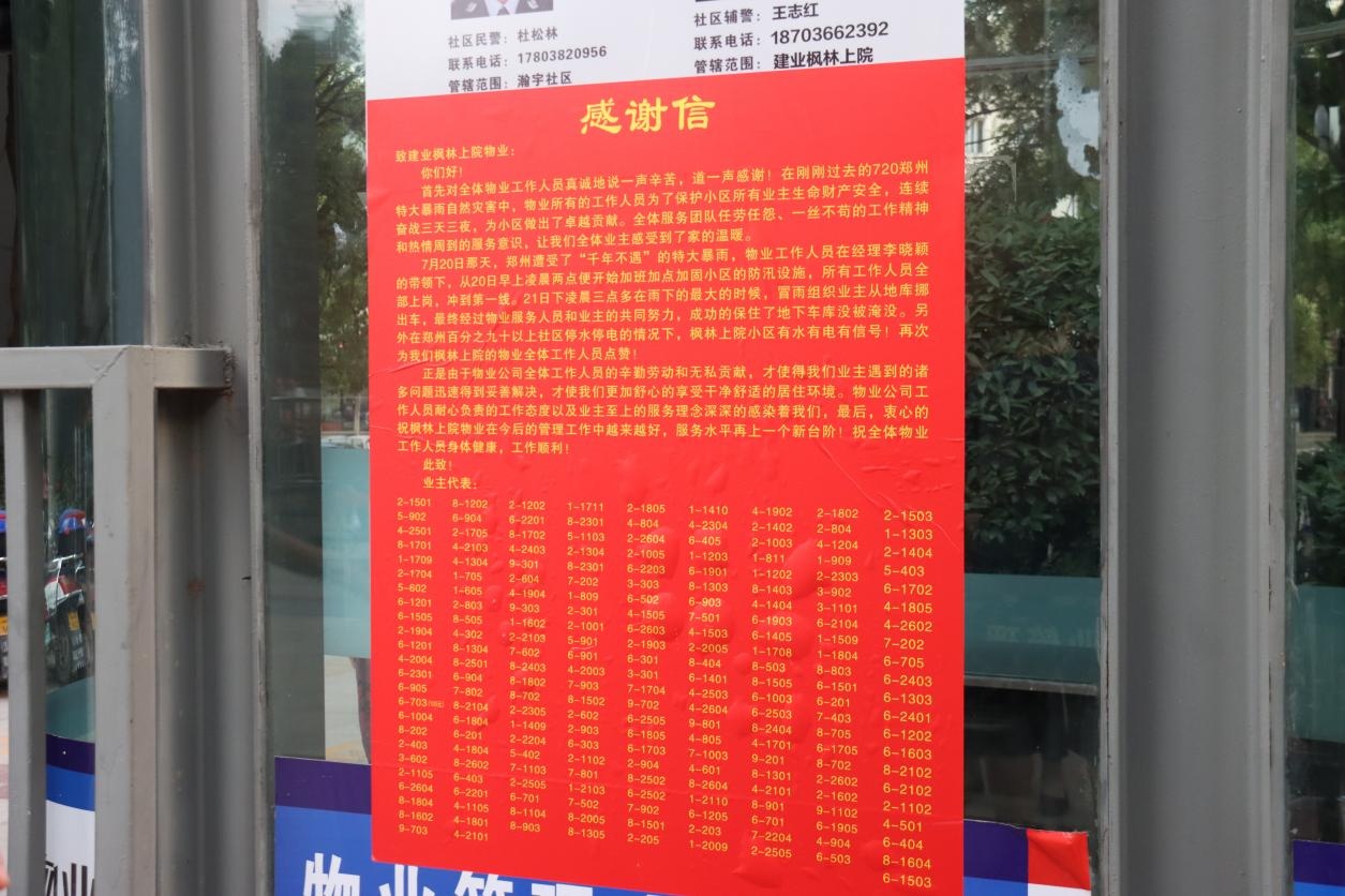 小區(qū)業(yè)主謝女士說:“物業(yè)在這次防汛中付出了很多,保障了我們的正常生活,孩子學(xué)校的其他家長都羨慕我們?cè)谘辞槠陂g還能正常上網(wǎng)課?!彪S后,她拿起手機(jī)向我們展示,在業(yè)主組建的微信群里,大家自發(fā)組織為物業(yè)送錦旗、送感謝信,業(yè)主們?cè)谌豪锝育垐?bào)名,想要當(dāng)面表達(dá)對(duì)物業(yè)的感謝。
